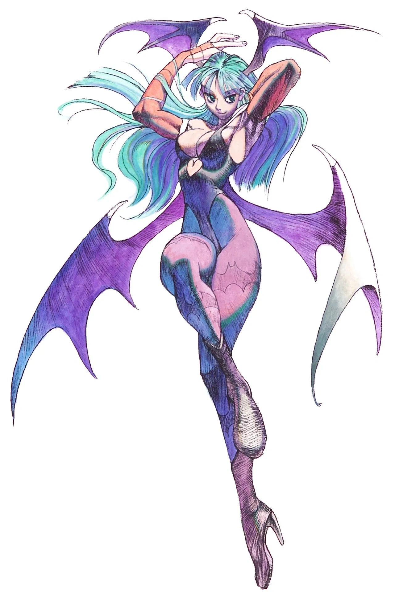 Morrigan appears as a beautiful woman with straight long, emerald green hair, and bat-like wings on her back and the sides of her head. Her hair is a hime cut which was a sign often used in Japanese media to indicate a woman was rich or of high status. The outside of her wings are black and the inside of her wings are either purple or hot pink mixed with purple. For her outfit, it consists of a sleeveless black leotard with feathers at the trim that mostly reveals her cleavage with a heart-shaped cutout under the chest, purple or magenta/hot pink tights with bat patterns, light rose-colored gloves that cover the middle finger, and black calf-length heeled boots.